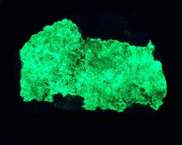 It is fluorescent under longwave ultraviolet light, but it’s even brighter under shortwave ultraviolet light. These photos were taken under shortwave ultraviolet light. Each specimen is different. You will receive the actual specimen in the photos. See other available pieces here: Hyalite Opal