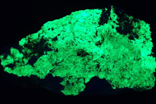 It is fluorescent under longwave ultraviolet light, but it’s even brighter under shortwave ultraviolet light. These photos were taken under shortwave ultraviolet light. Each specimen is different. You will receive the actual specimen in the photos. See other available pieces here: Hyalite Opal